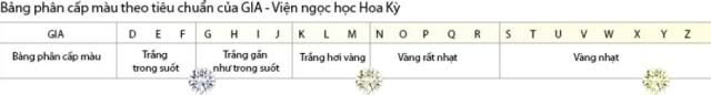 Color (màu sắc): Đối với kim cương trắng thì màu sắc có thể phân ra nhiều cấp độ từ không màu đến màu vàng nhạt và viên kim cương càng trắng thì càng hiếm và giá trị càng cao. Trong bảng xếp loại màu kim cương trắng của GIA (Viện Ngọc Học Hoa Kỳ), màu trắng của kim cương bắt đầu từ ký tự D, E, F... cho loại trắng không màu và xếp dần xuống đến Z. Cách tốt nhất để thấy được màu sắc thật sự của một viên kim cương là nhìn nó đối diện với một mặt phắng màu trắng.